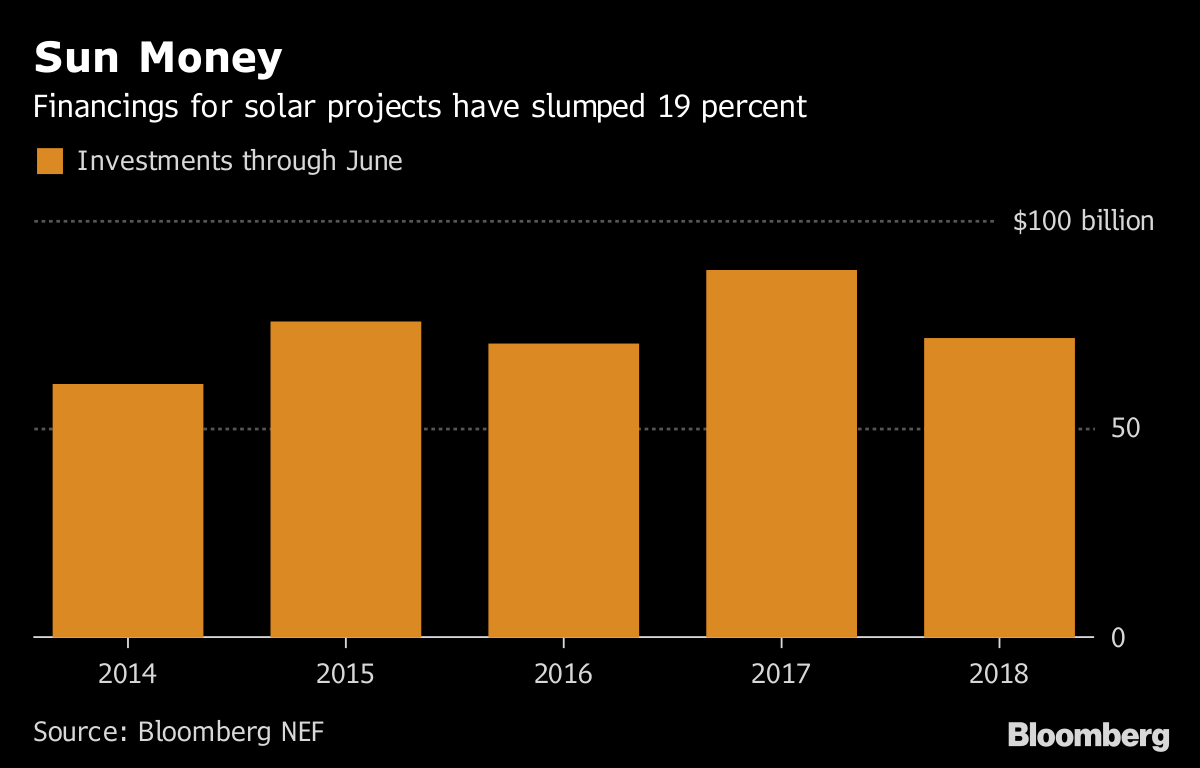 但中國并不是太陽能投資滯后的原因。太陽能電池板的平均價格在去年下降了19。這意味著太陽能發(fā)電場建設(shè)成本更低,因此需要的投資降低。